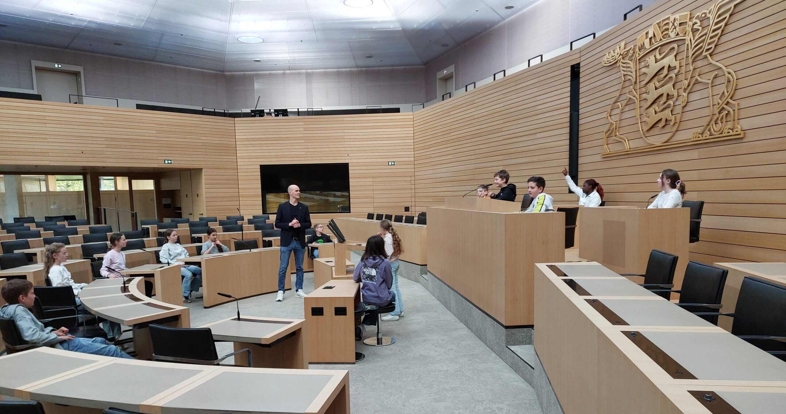 Besuch der Klassenstufe 10 im Landtag von Baden-Württemberg. Verschiedene parlamentarische Rollen dürfen dabei ausprobiert werden.