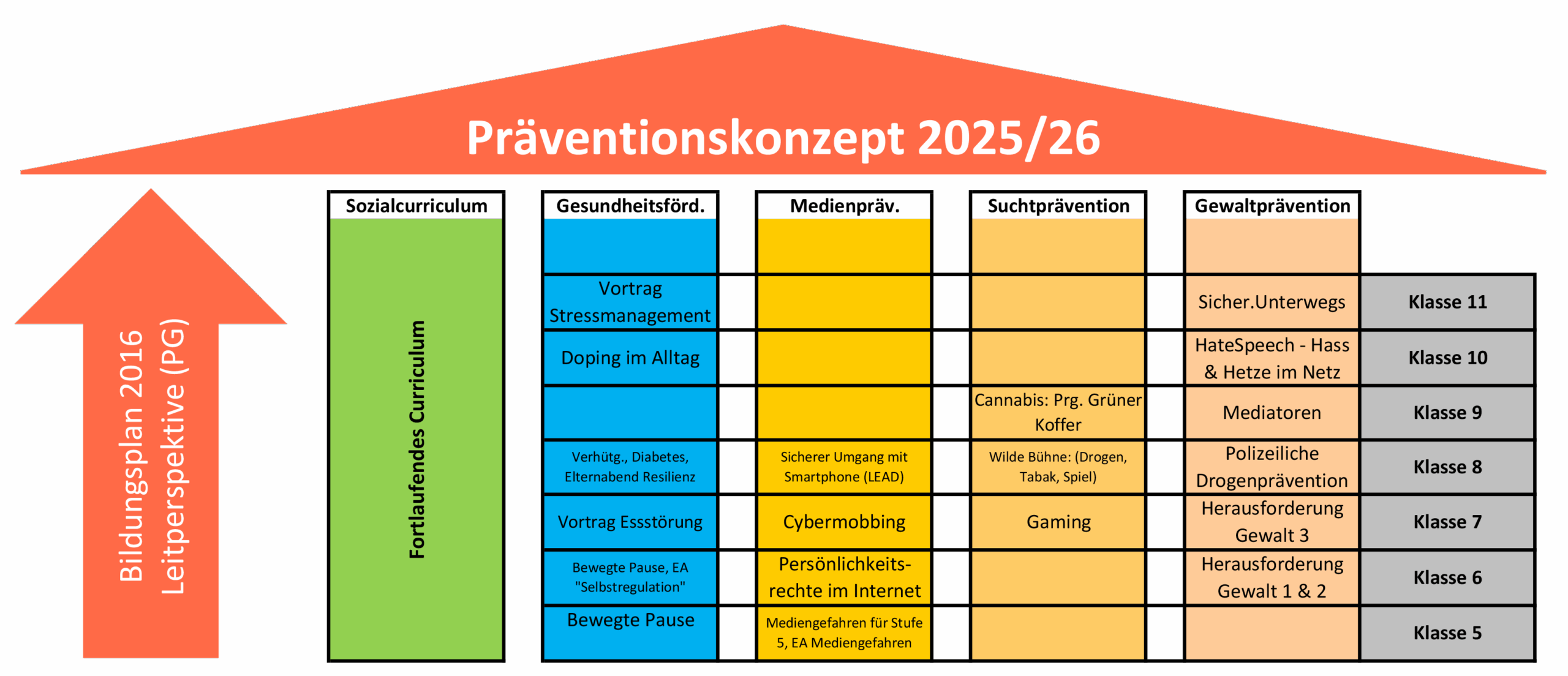 Das Präventionskonzept des Gymnasiums Rutesheim basiert auf mehreren Säulen. Zum einen die drei Bereiche der Prävention (Medien-, Sucht- und Gewaltprävention), daneben der Bereich Gesundheitsförderung, flankiert vom Sozialcurriculum. Ergänzt wird unser Konzept durch die Leitperspektiven des Bildungsplans 2016.
