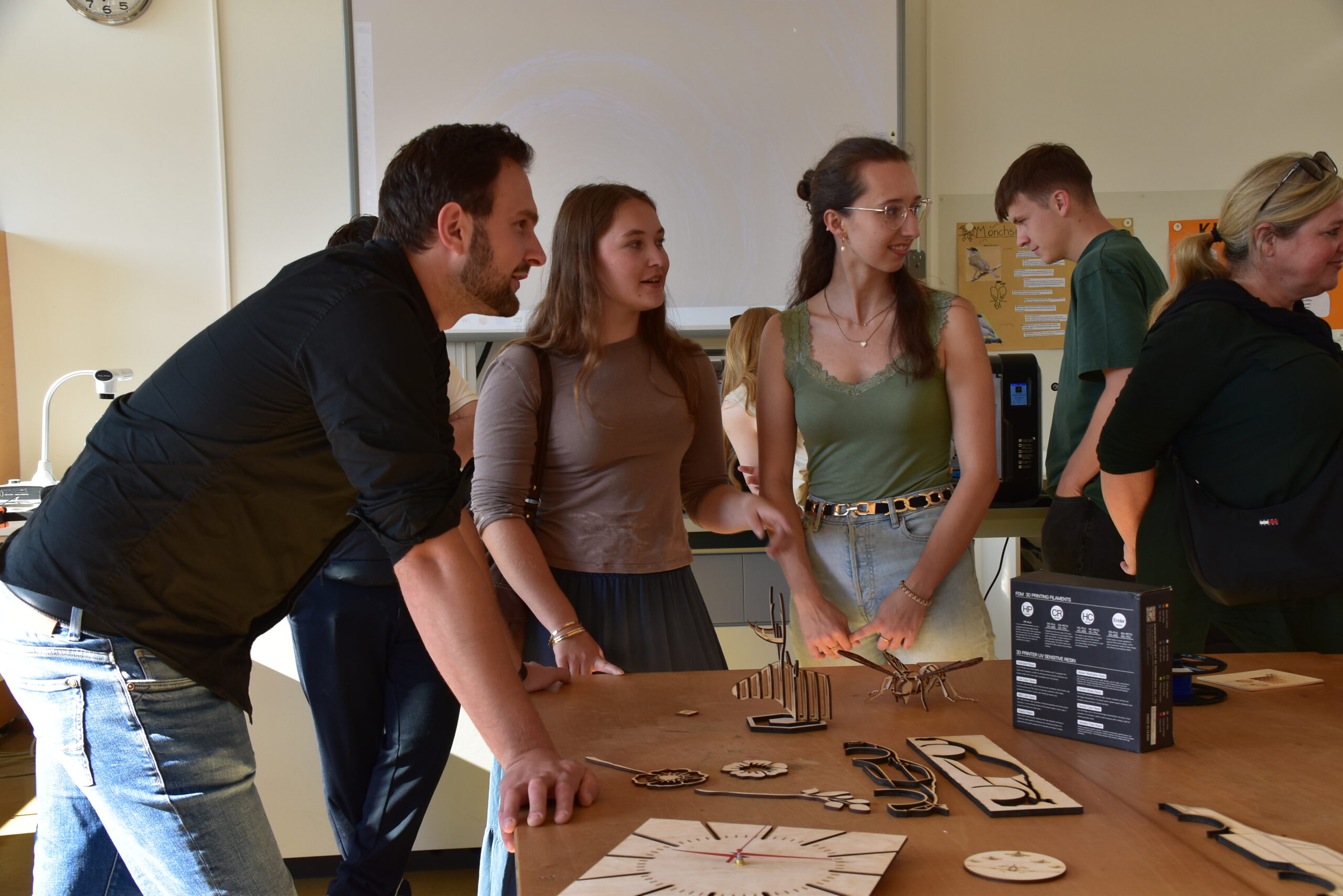Im Schulhaus konnten in verschiedenen Räumen die Ergebnisse der Projekttage bestaunt werden. Als absoluter Besuchermagnet stellten sich dabei die 3D-Drucker und der Lasercutter der NwT-Fachschaft heraus, aber auch die Bilder und Skizzen aus den Kunst-Projekten stießen auf große Bewunderung.