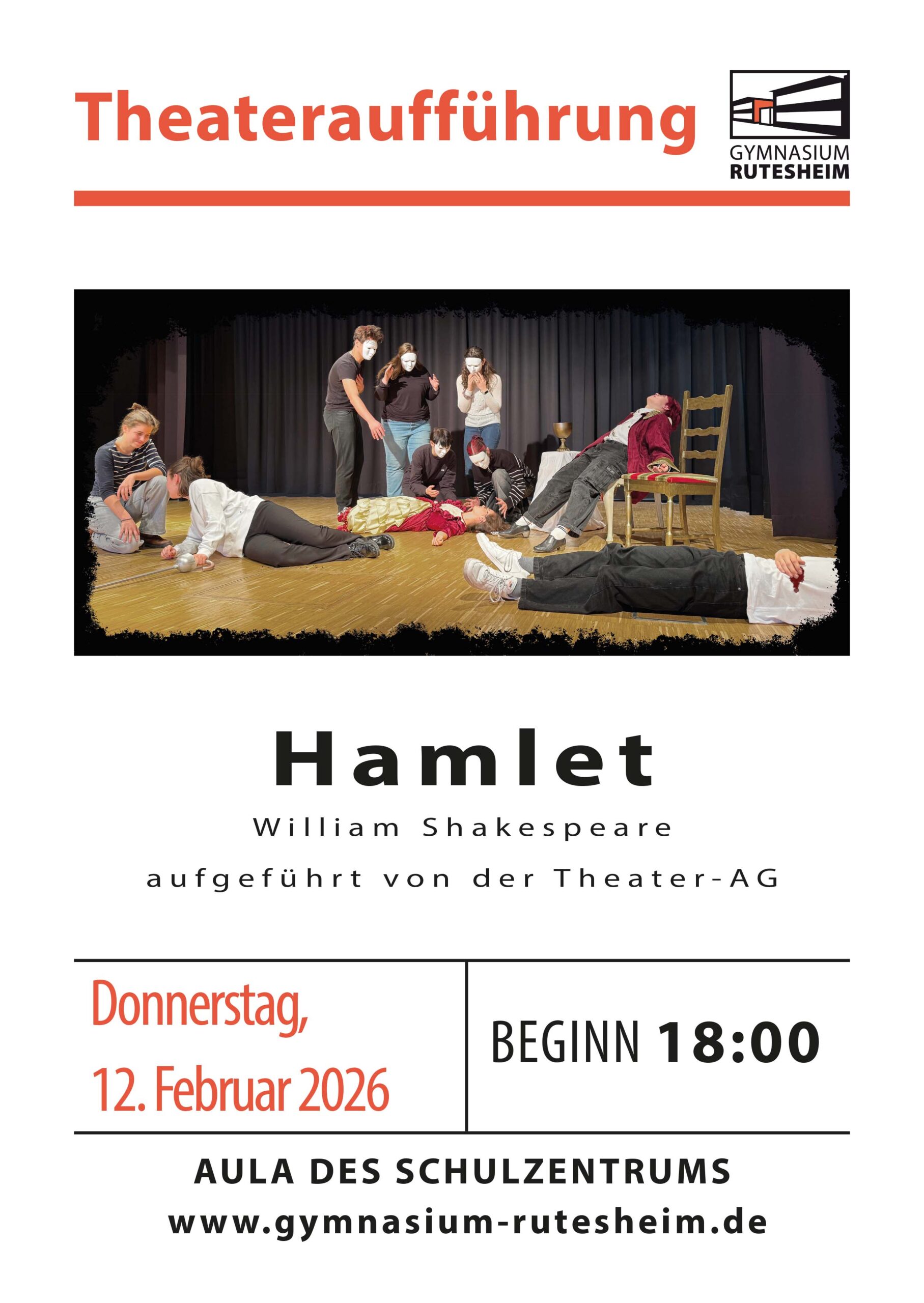 Schauspielerinnen und Schauspieler aus Mittel- und Oberstufe bringen William Shakespeares weltbekanntes Werk „Hamlet“ auf Rutesheimer Bretter, die die Welt bedeuten. Die schockierende Tragödie bewegt schon seit Jahrhunderten mit ihren spannenden Figuren und dramatischen Wendungen die Gemüter der Zuschauenden.