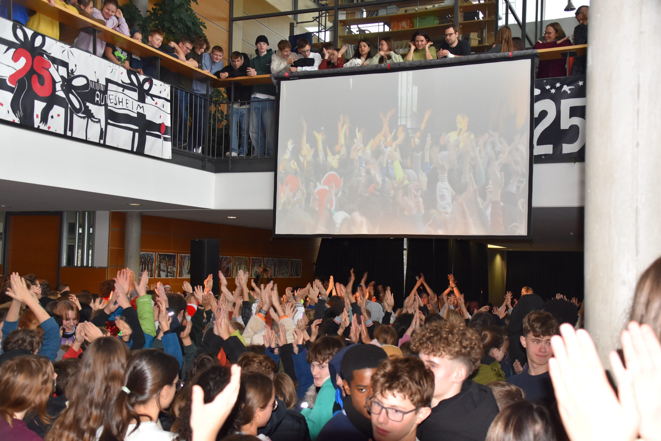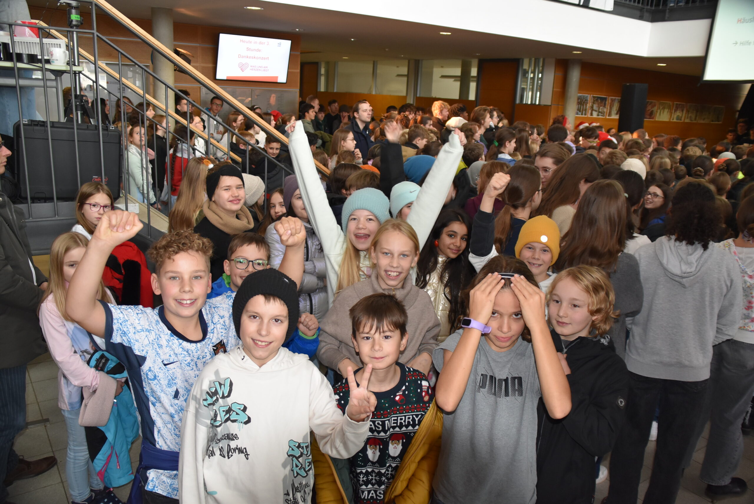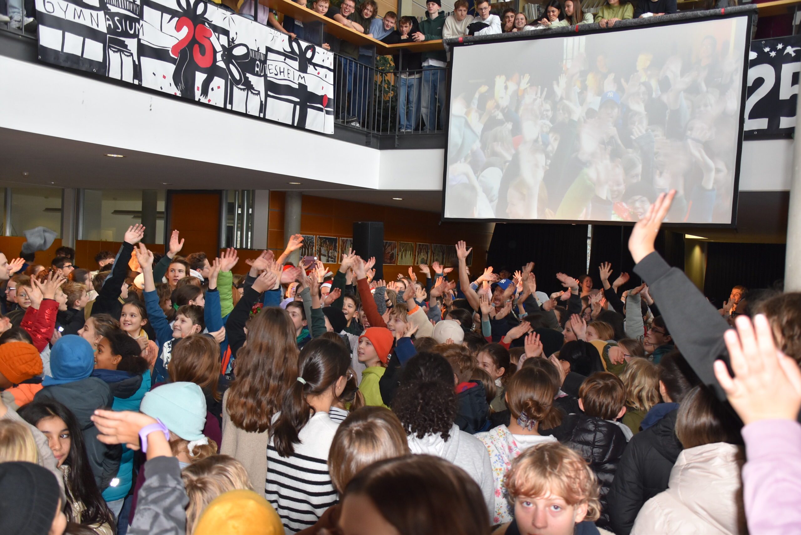 Zum Dank für die tolle Spendenbereitschaft des Gymnasiums Rutesheim und das langjährige Engagment der SMV für den Verein WUAHL (der sich für das Projekt HOPPS am Olgahospital in Stuttgart einsetzt) kamen Musikerinnen und Musiker von WUAHL für ein Dankeskonzert ans Gymnasium Rutesheim. Mit ihren letzten Aktionen konnte die SMV unglaubliche 7.000€ für WUAHL sammeln. Der Scheck war bereits am beim großen Spendenkonzert im Oktober überreicht worden. Und nun der Dank an alle Schülerinnen und Schüler, die sich riesig über das mitreißende Konzert freuten. Über eine Stunde begeisterten die neun Musikerinnen und Musiker von WUAHL mit ihren kraftvollen Stücken und brachten die Schülerinnen und Schüler zum Tanzen, Singen und Spaß haben. Wir danken WUAHL von ganzen Herzem für diesen besonderen Vormittag und freuen uns auf ein Wiedersehen!